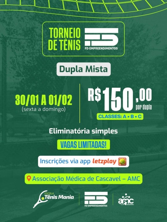 Cascavel e Paraná - A Associação Médica de Cascavel (AMC) sediará, entre os dias 30 de janeiro e 1º de fevereiro, o Torneio de Tênis – Dupla Mista FD Empreendimentos, evento que integra o calendário esportivo da entidade e reunirá atletas em um fim de semana dedicado ao esporte e à convivência.