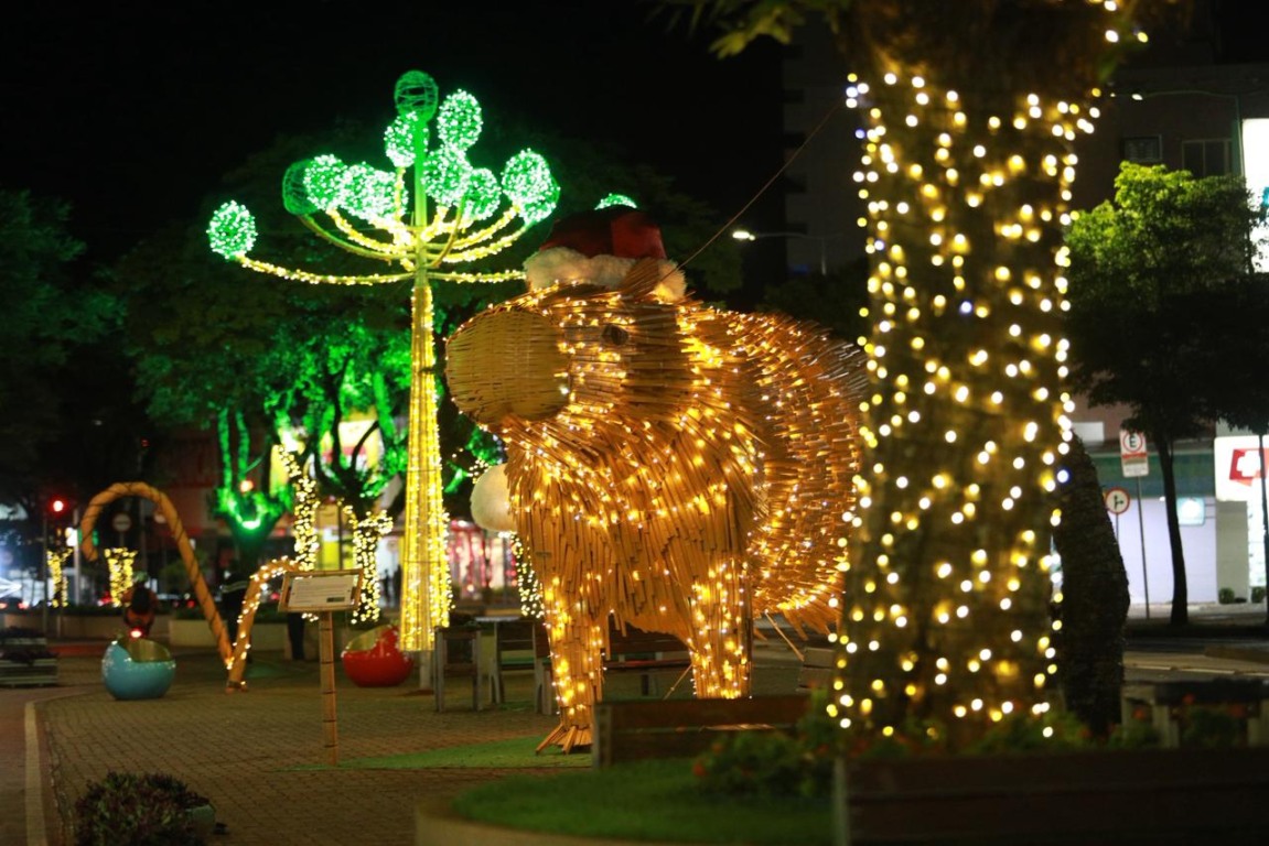 Pelo segundo ano consecutivo, Cascavel apostou no bambu como identidade estética natalina: capivaras, pássaros e árvores estilizadas. Sem a árvore flutuante, o custo da decoração já supera R$ 2,6 milhões. Com ela, o investimento chega a R$ 3,593 milhões — um salto significativo para algo essencialmente efêmero.