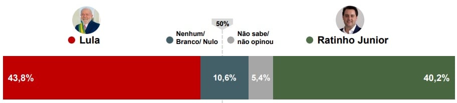 No levantamento, realizado com 2.038 eleitores em todo o Brasil, Ratinho Junior soma 40,2% das intenções de voto em um eventual segundo turno contra Lula, que registra 43,8%. Considerando a margem de erro de 2,2 pontos percentuais, o cenário configura empate técnico e indica equilíbrio entre os dois nomes. O desempenho chama atenção por ser registrado diante de uma pesada campanha publicitária de projeção do “Governo Lula 3”.